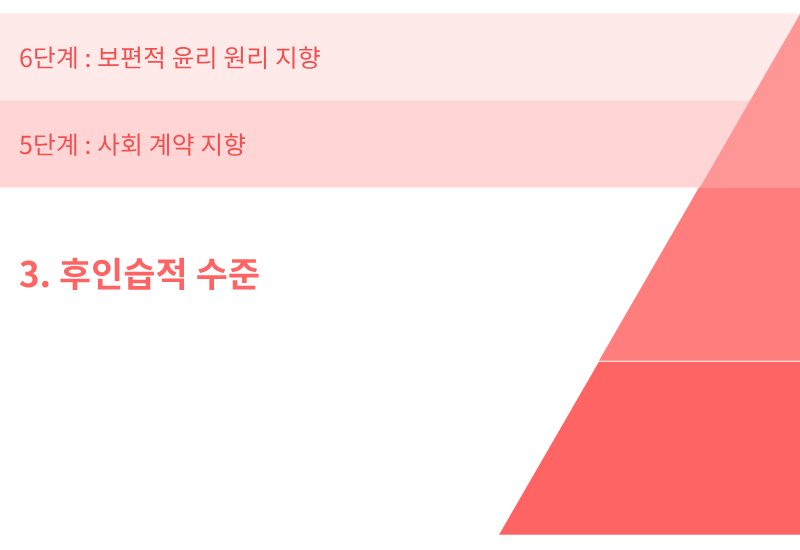 - 후인습적 단계 : 보편적인 도덕 원칙과 개인적인 양심에 기반한 판단.