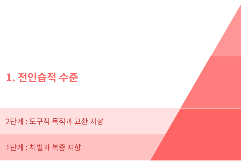 - 전인습적 단계 : 개인적인 욕구와 외부의 처벌에 기반한 판단.